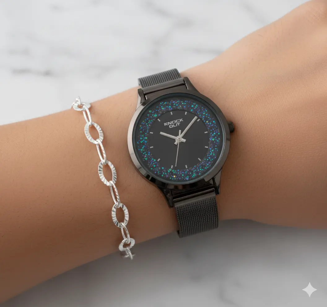 Este reloj Knock Out Galaxy es el accesorio perfecto para quienes buscan un toque de elegancia y misterio. Con un diseño monocromático en color negro grafito , destaca por su caja y malla de acero de estilo "milanesa" que le dan un aspecto moderno y refinado. El verdadero protagonista es el dial, que se deslumbra con un círculo de microcristales iridiscentes que brillan con destellos verdes, azules y violetas, creando un efecto similar a una galaxia. Este reloj es ideal para complementar un look de noche o para añadir un detalle chic y sofisticado a cualquier atuendo